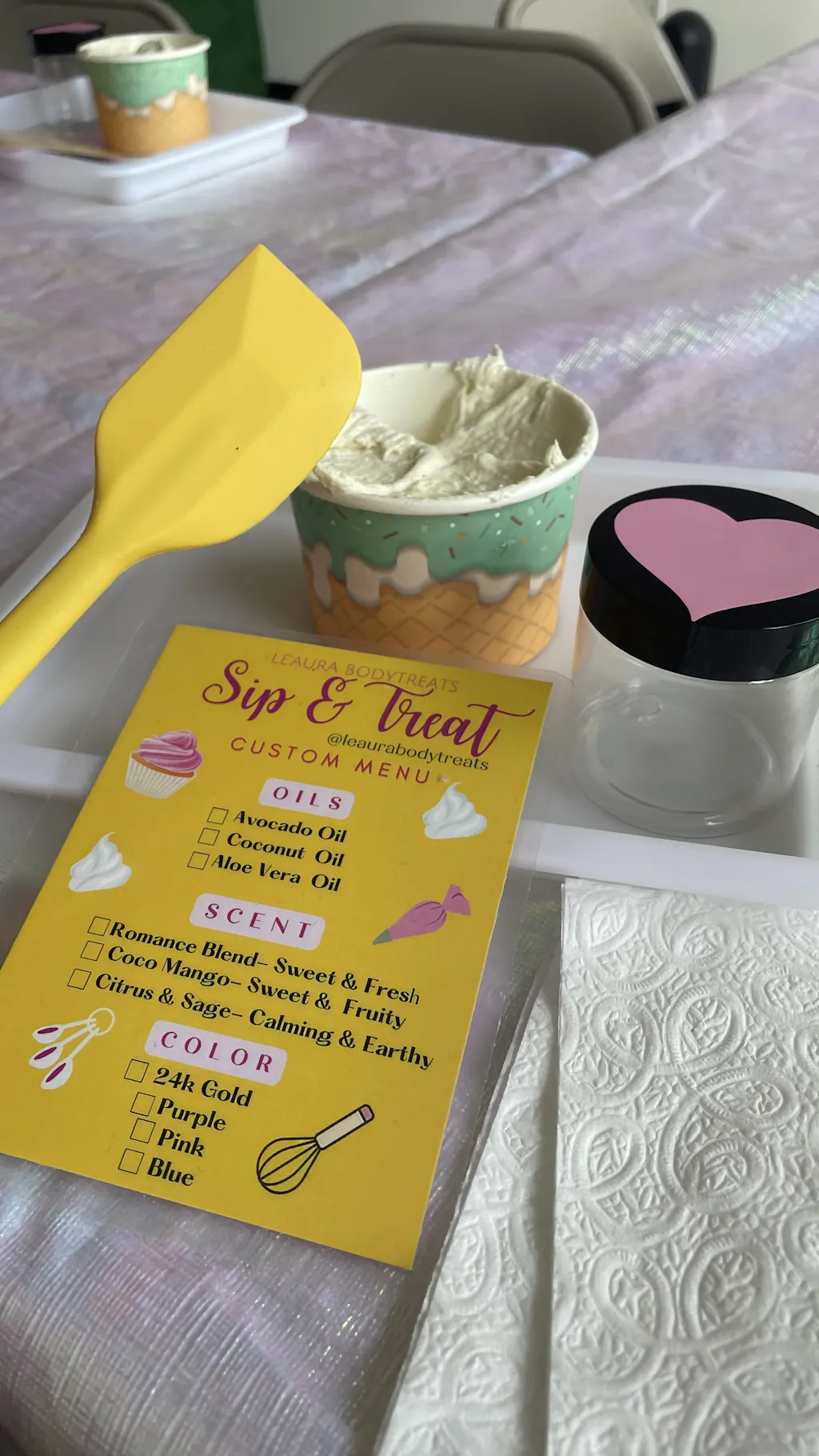 I thoroughly enjoyed my experience at Le’Aura. To be able to make body butters while drinking bottomless mimosas is a win win. I went for my friends birthday and it was a cute little vibe. The space has a floral garden type decor with different props which makes for great photo ops.